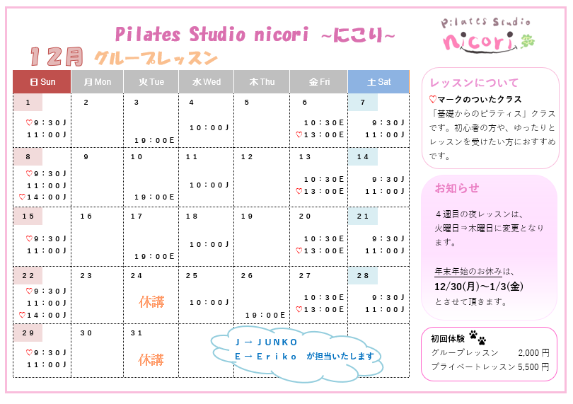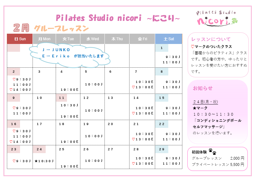 ♡マークのついたクラスは「基礎からのピラティス」クラスです。