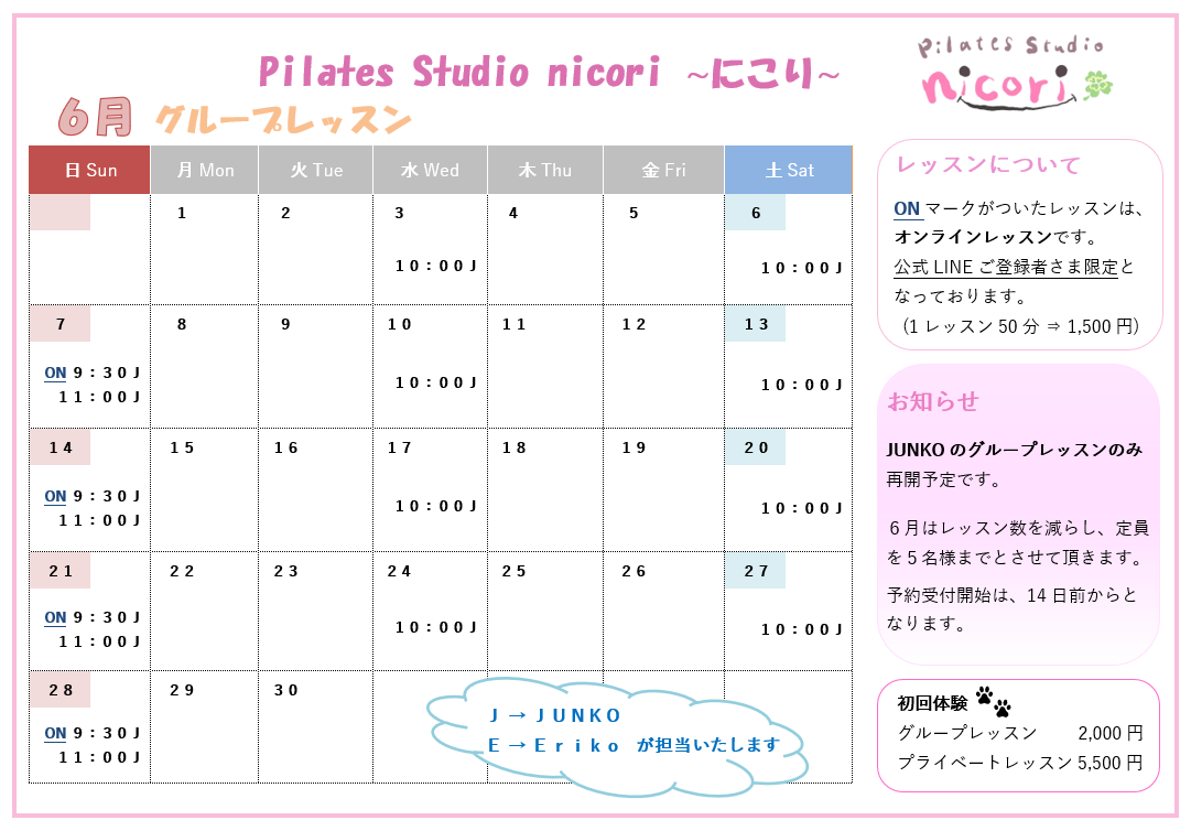 6月3日(水)より、スタジオレッスンを再開致します。